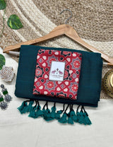 Deep rama green saree with red printed blouse