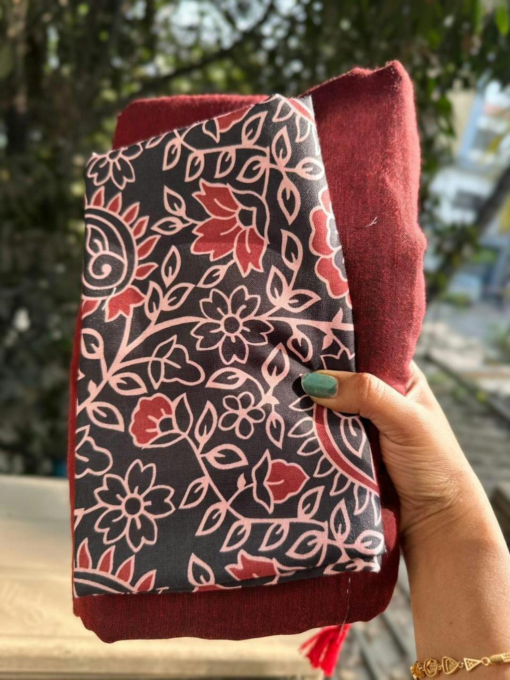 Crafted from premium handloom cotton, this saree offers breathable comfort and a subtle sheen that enhances its luxurious appeal. The accompanying blouse is made from fine cambric cotton, featuring an exquisite black floral print designed to perfectly complement the rich maroon body of the saree.