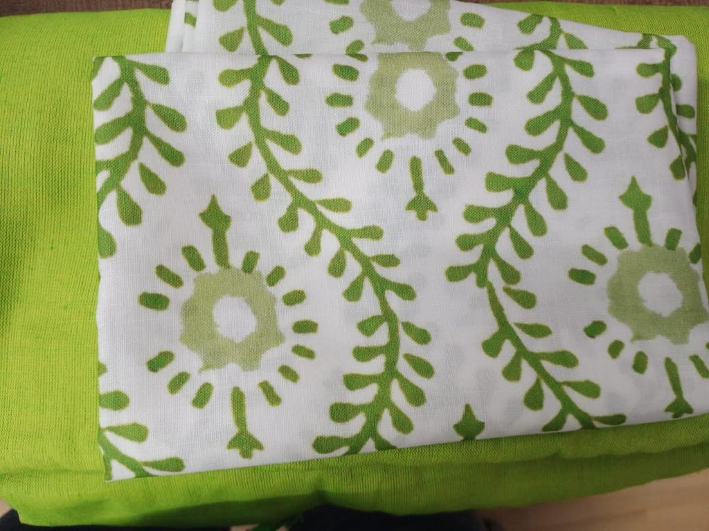 Crafted from premium materials, the saree features a vibrant royal apple green hue, beautifully complemented by a delicate white floral blouse made of soft cambric cotton. This combination creates an effortlessly graceful look, ideal for festive occasions or classy evenings.