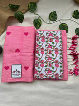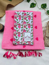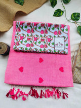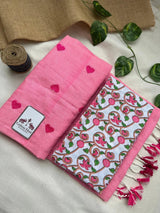 Delicate and timeless, this baby pink cotton embroidered handloom saree is a graceful addition to your ethnic wardrobe. Made from soft, breathable cotton, it features subtle embroidery that adds texture and charm without overpowering the look. Paired with a white flower printed blouse, the ensemble feels fresh, feminine, and effortlessly stylish. Perfect for daytime functions, festive gatherings, or casual celebrations, this saree blends traditional handloom artistry with soft, modern elegance.