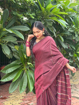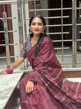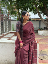 Maroon cotton handloom ghicha stripes saree with Black kalamkari printed blouse