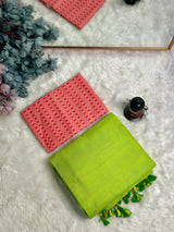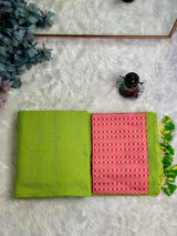 Premium Handloom Cotton Saree - Parrot green saree with ruby red blouse