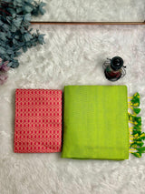 Experience the allure of exclusivity with this Premium Handloom Cotton Saree, a masterpiece that elevates traditional elegance to a new pinnacle. Designed for the discerning individual, this parrot green saree paired with a ruby red blouse is a rare find that promises to make every occasion memorable.