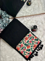 Made from the finest pure handloom cotton, the fabric offers a breathable and comfortable experience unlike any other. The deep, rich black hue presents a timeless and versatile canvas, complemented gracefully by the subtle cream floral accents on the blouse piece. This harmonious combination highlights the premium materials used to create a truly luxurious ensemble.