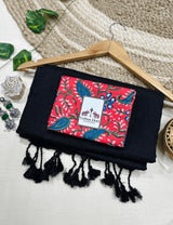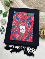 Premium Handloom Cotton Saree - Pure cotton handloom Black saree with Red printed blouse