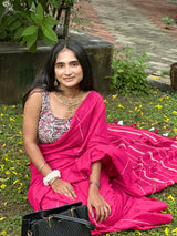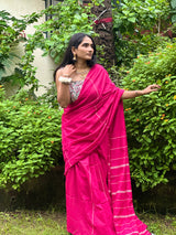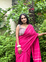 Rani Pink Ghicha Stripe Cotton Handloom Saree With Printed Blouse