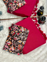 Crafted from pure handloom cotton, this saree features a soft, breathable, and lightweight fabric that offers exceptional comfort, especially in warm weather. The vibrant cherry red hue paired with a contrasting black printed blouse creates a striking blend of classic charm and contemporary style, making it perfect for both festive occasions and everyday wear.
