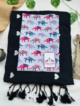 42% OFFExude elegance and tradition with this oil black cotton handloom saree, woven from soft, breathable cotton for all-day comfort and a graceful drape. The deep, rich black shade adds a timeless sophistication, perfectly complemented by the unique elephant printed blouse that brings a touch of cultural artistry and charm. Ideal for festive occasions, cultural events, or stylish everyday wear, this saree beautifully marries classic handloom craftsmanship with bold, distinctive design.